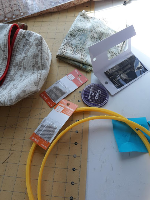 So I've got the hand quilting project back together and went and bought needles. The last time I tried this, I had a booger of a time getting the needle through the layers. I really didn't know which needle to go with, so I bought some of everything. I was disappointed that I couldn't use the pearl cotton but I found a very pretty ochre colored quilting thread and it seems the quilting betweens work best. Guess I should have figured that.